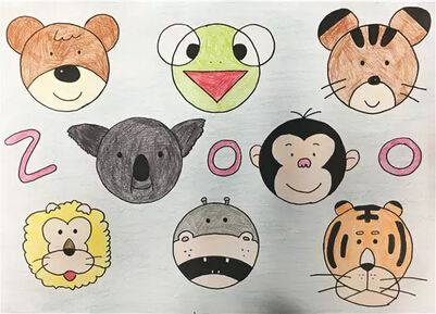 我喜歡動物,也喜歡去動物園看動物,因此我用圓形的元素添畫了各種動物:小熊、青蛙、松鼠、考拉、猩猩、獅子、河馬還有老虎,它們都是我很喜歡的動物。