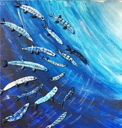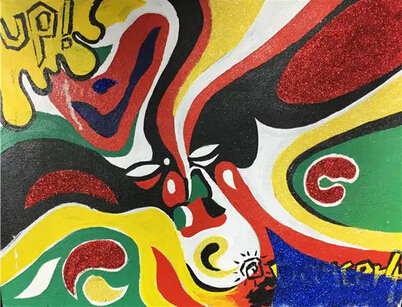 《話臉譜》是由我國傳統(tǒng)戲劇臉譜為基礎(chǔ),經(jīng)過線條、色塊的變形,表現(xiàn)出更為夸張的臉部表情。整體色彩鮮明,對比強烈,亮晶晶的粉末裝飾成為點睛之筆,使傳統(tǒng)的京劇臉譜變得更加鮮活、閃亮。