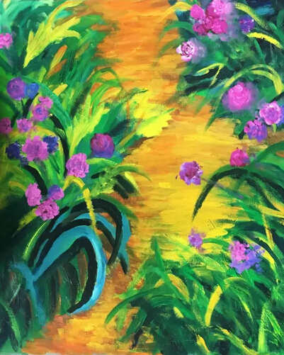 馬勺丙烯畫。在馬勺上,用丙烯顏料畫出房子前的大海,以及周邊的花叢。
