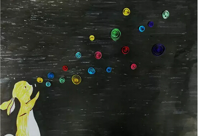 彩色的泡泡都是我用衍紙紙條一個一個卷成的,再把它們一個一個粘到紙上。我最喜歡吹泡泡了,彩色的泡泡帶著我的夢飄呀、飄呀,飄向遠方……