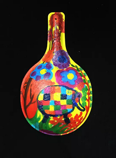 在馬勺上用丙烯顏料,給大象安個五顏六色漂亮的家。